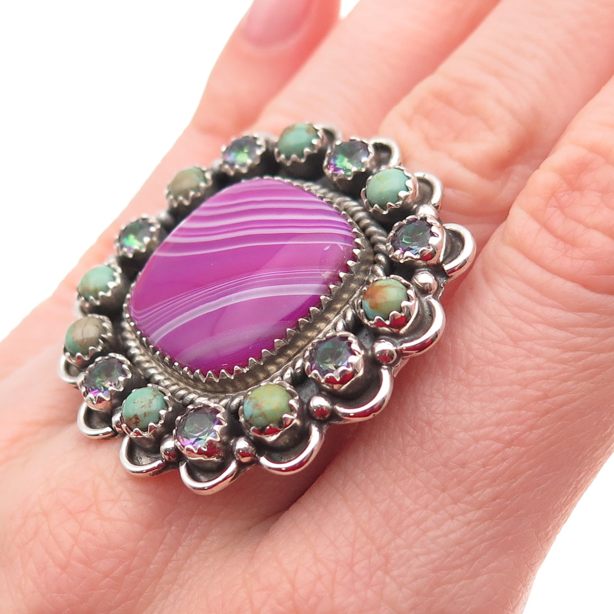 925 Sterling Silver Vintage Real Agate Turquoise & Mystic Quartz Ring Size 7.25