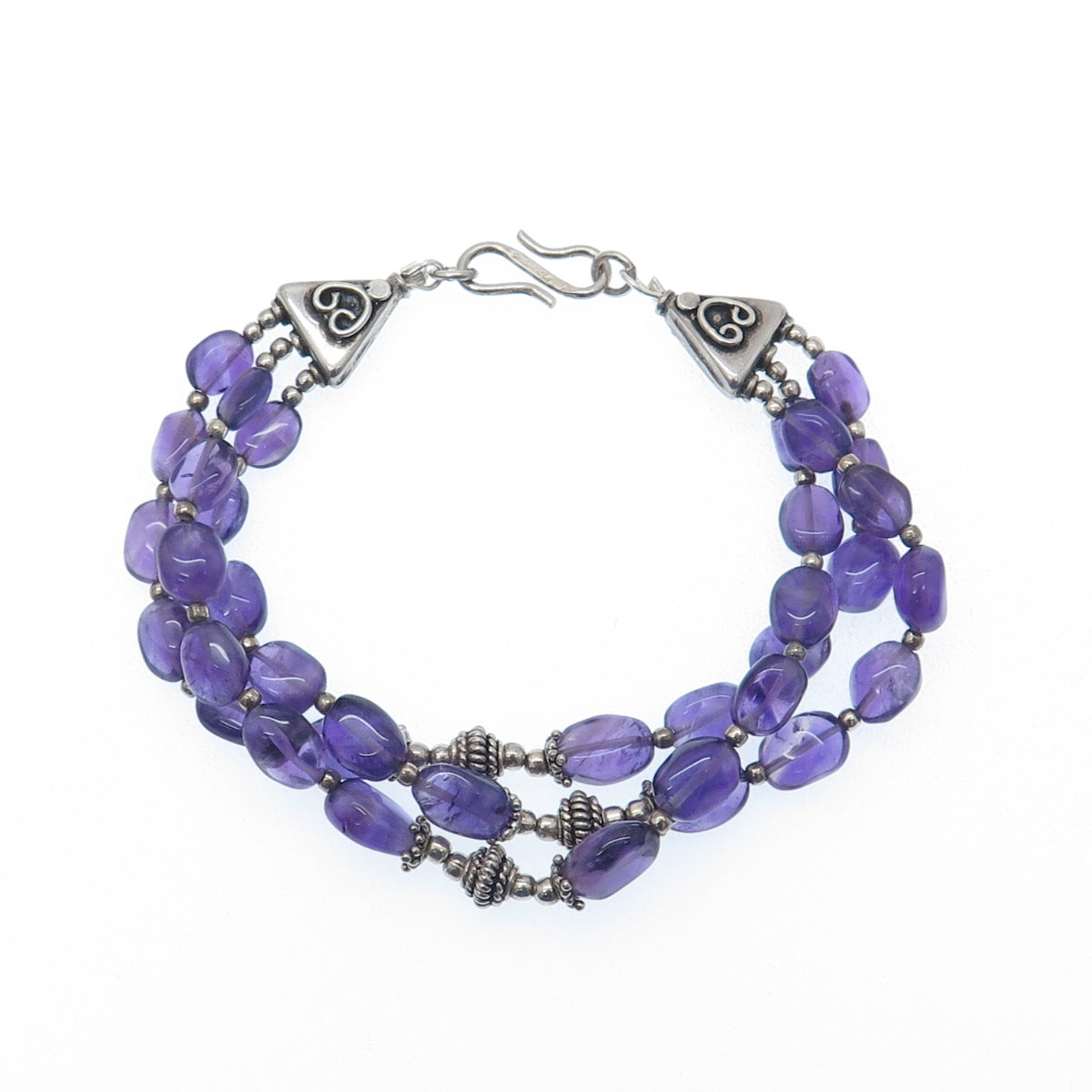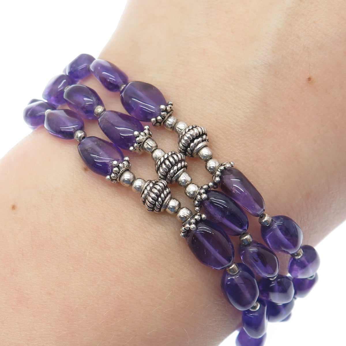 925 Sterling Silver Vintage Real Amethyst 3-Strand Beaded Bracelet 7.25"