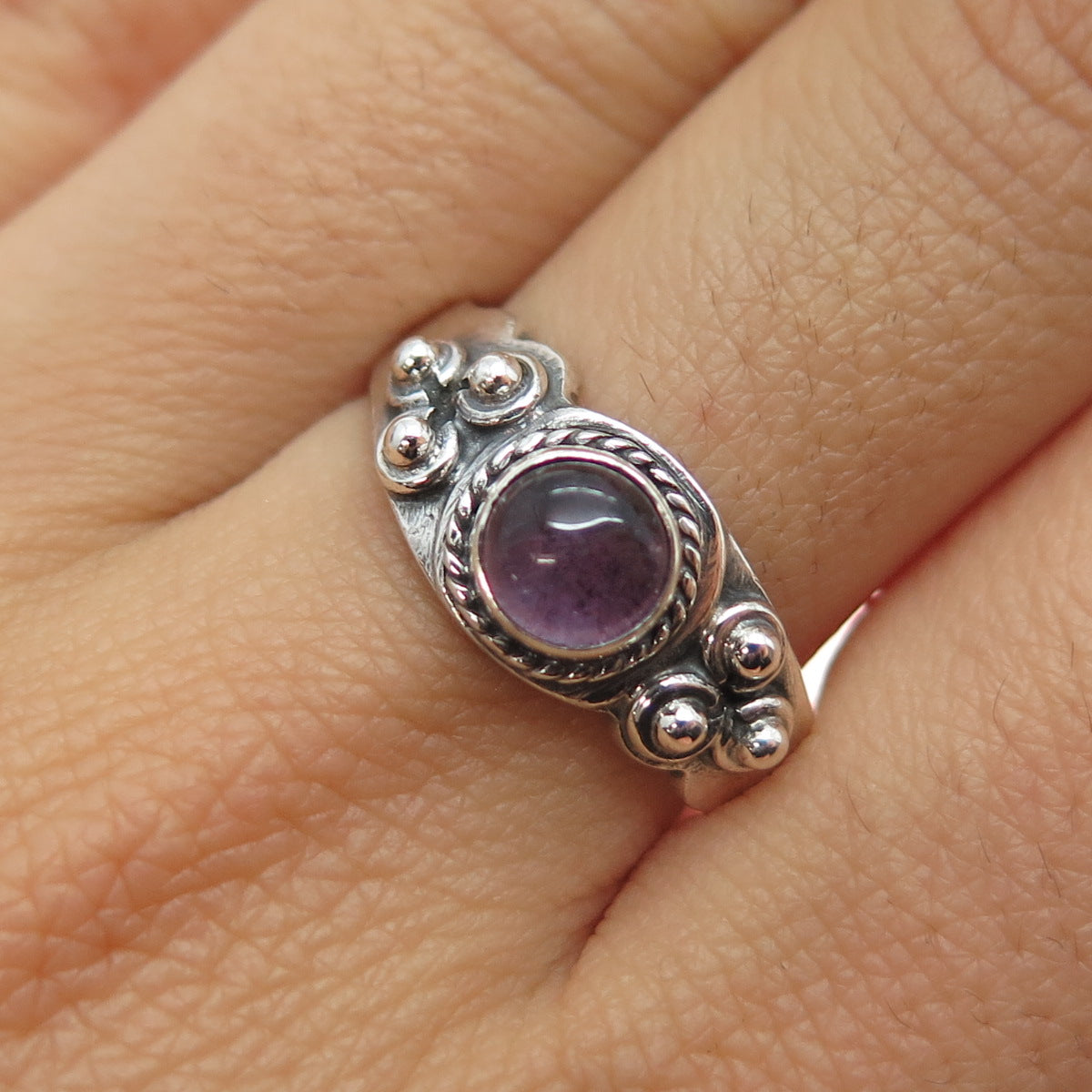 925 Sterling Silver Vintage Real Amethyst Beaded Oxidized Ring Size 9