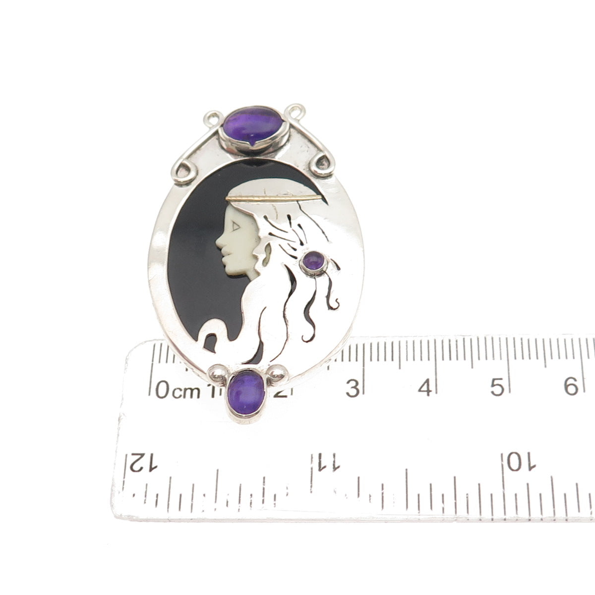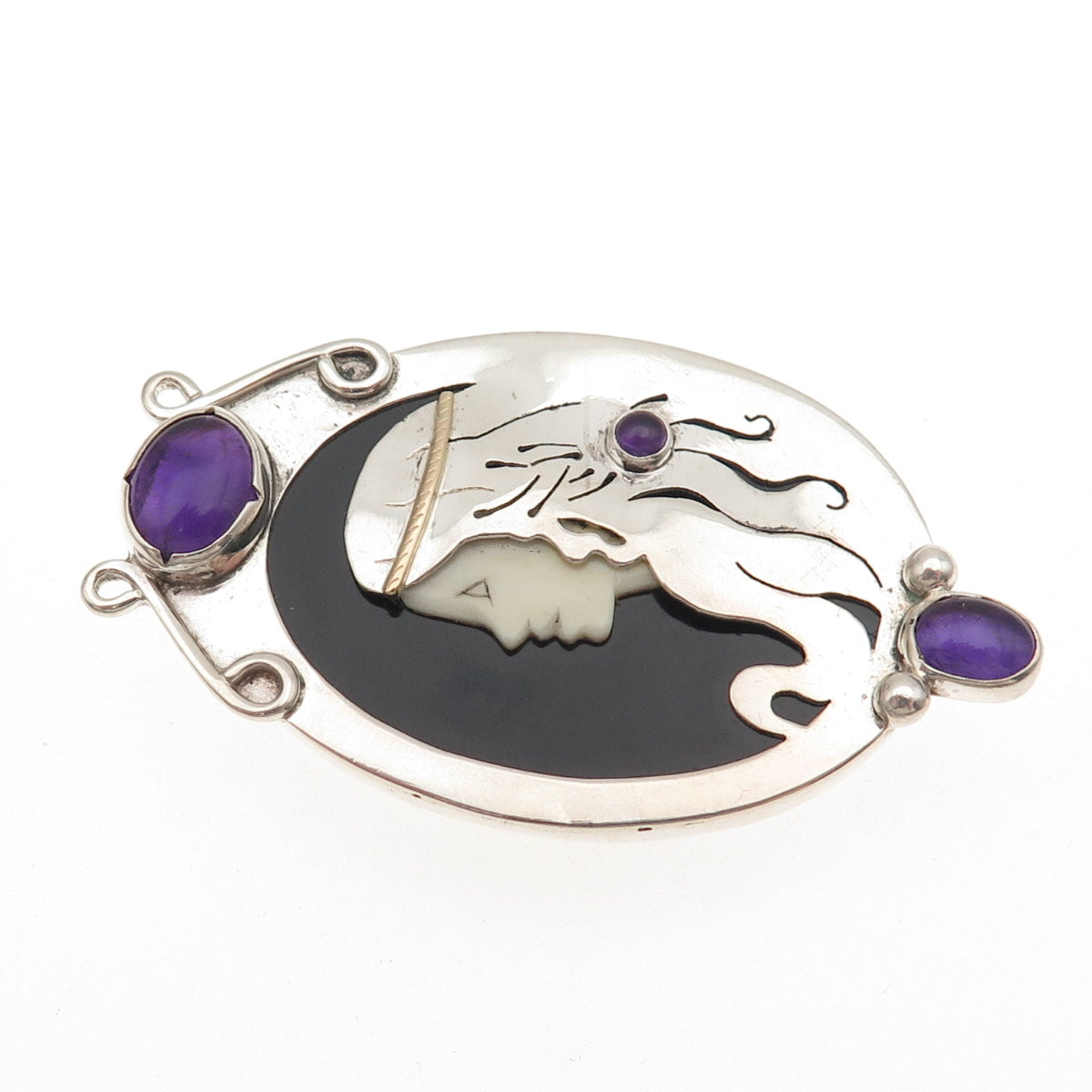 925 Sterling Silver Vintage Real Amethyst & Black Onyx Lady Centerpiece Pendant