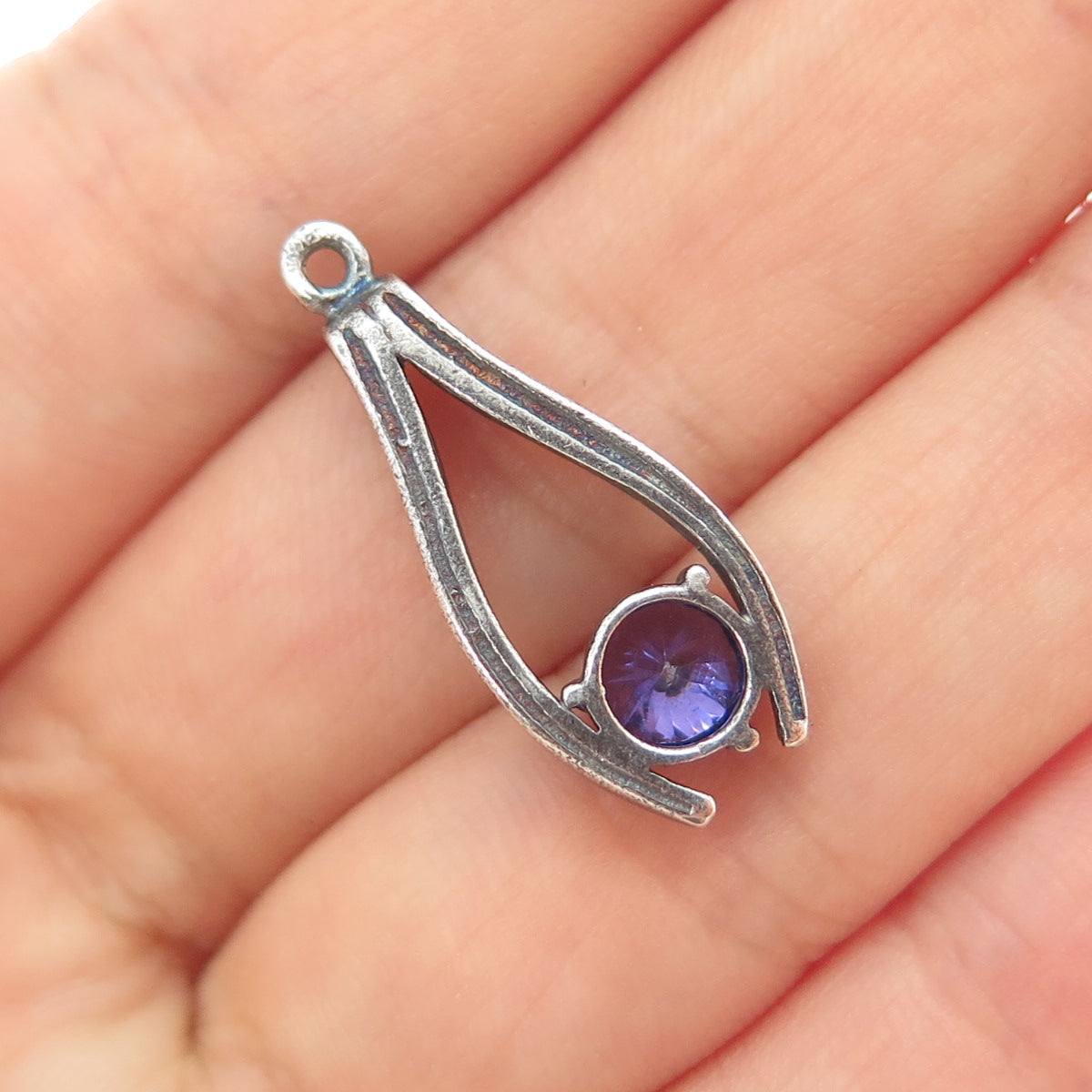 925 Sterling Silver Vintage Real Amethyst Modernist Oxidized Charm Pendant
