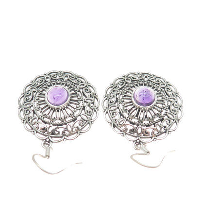925 Sterling Silver Vintage Real Amethyst Ornate Flower Dangle Earrings
