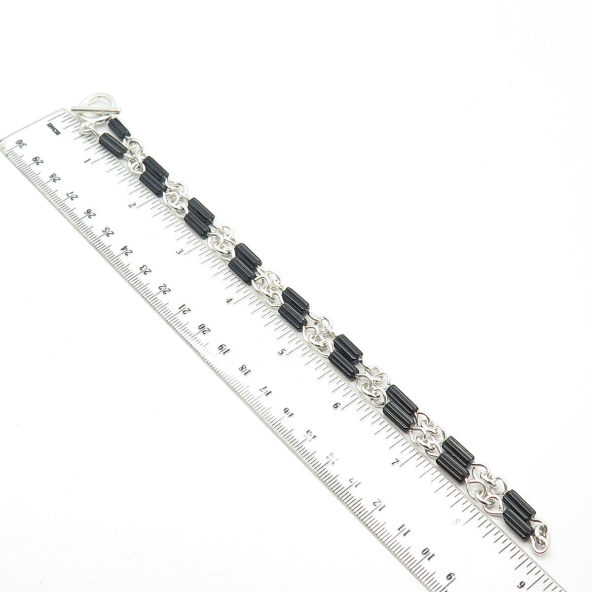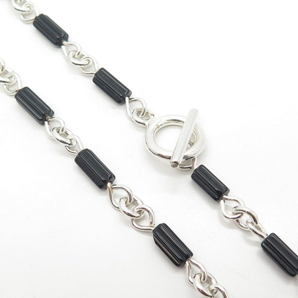 925 Sterling Silver Vintage Real Black Onyx Gem Bar Beaded Chain Necklace 16"