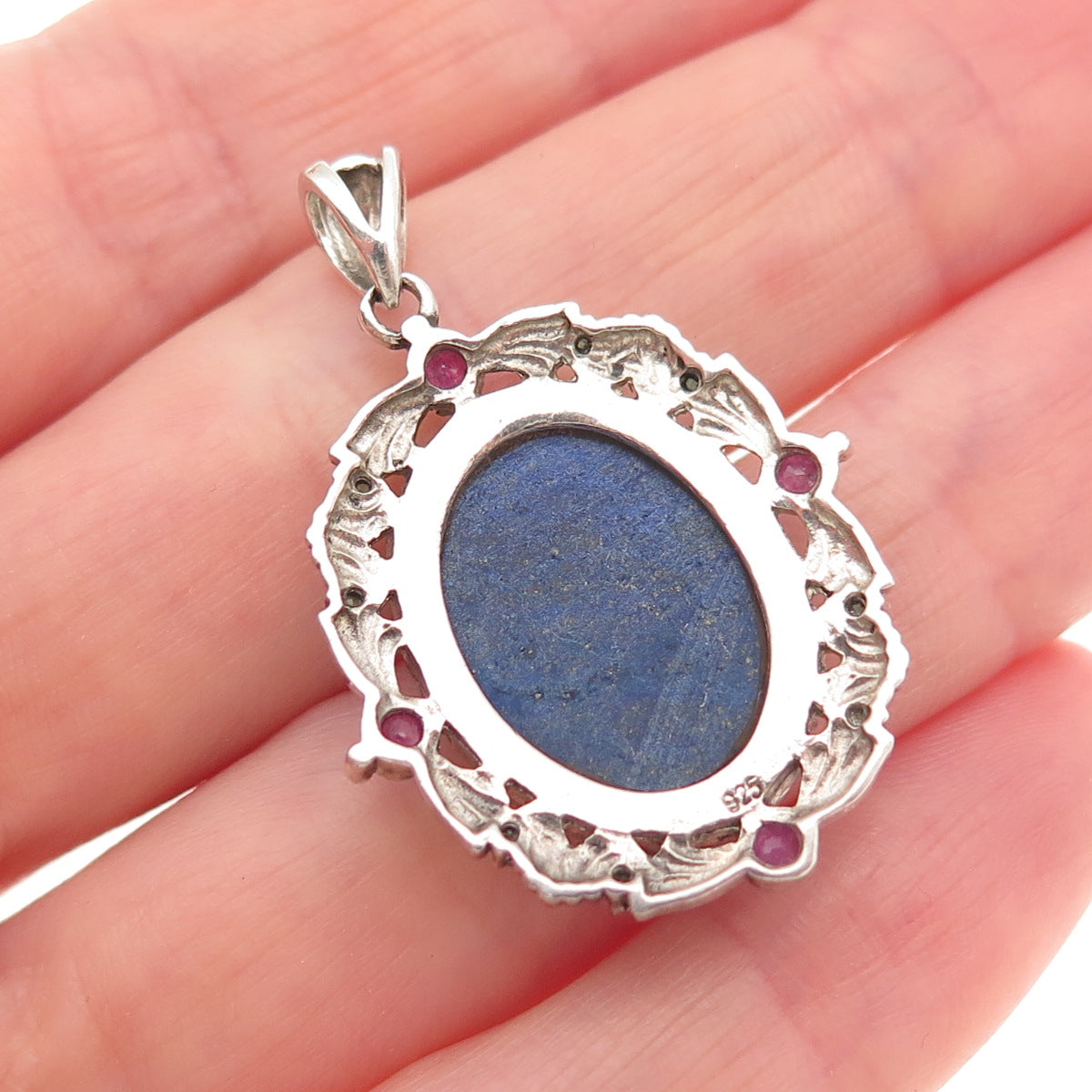 925 Sterling Silver Vintage Real Lapis Ruby & Emerald Lady Cameo Charm Pendant
