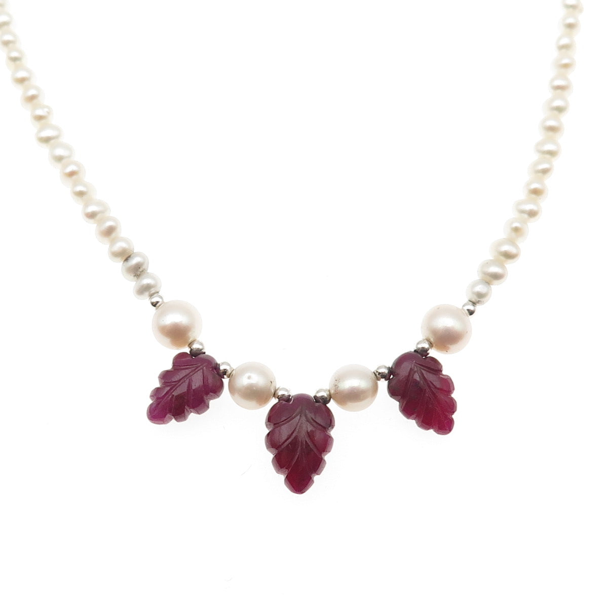 925 Sterling Silver Vintage Real Pearl & Ruby Floral Beaded Necklace 16-18"