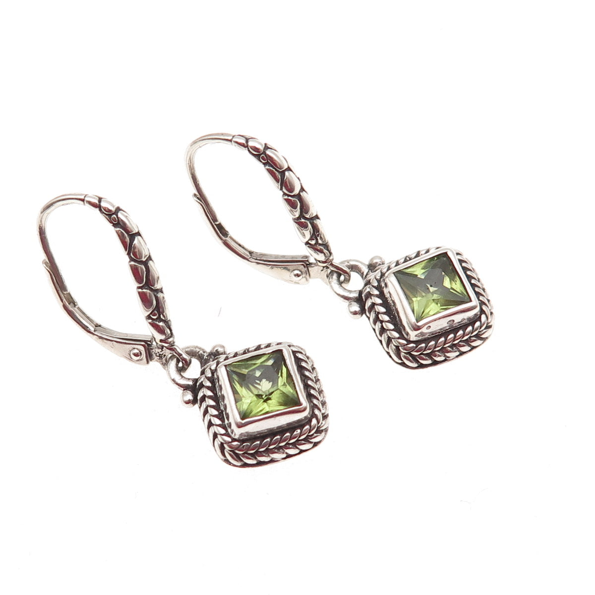 925 Sterling Silver Vintage Real Princess-Cut Peridot Dangle Earrings