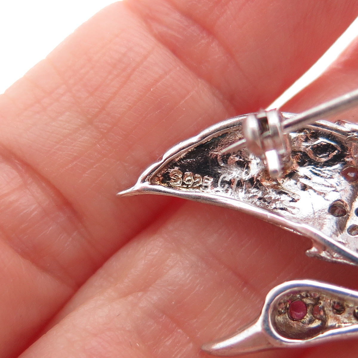 925 Sterling Silver Vintage Real Ruby & Rhinestone Swan Pin Brooch