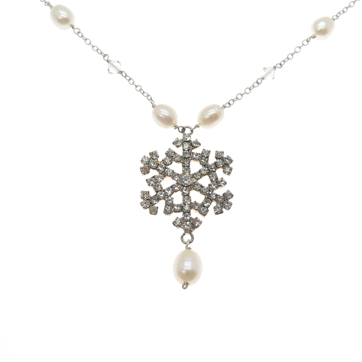 925 Sterling Vintage Real Pearl By The Yard & Rhinestone Snowflake Necklace 16"