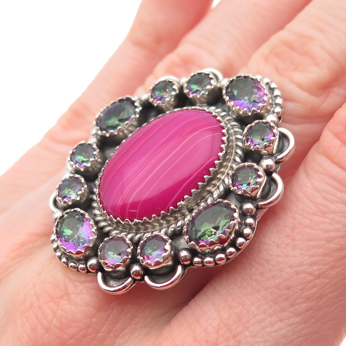 925 Sterling Vintage Real Pink Agate & Mystic Quartz Statement Ring Size 8.25