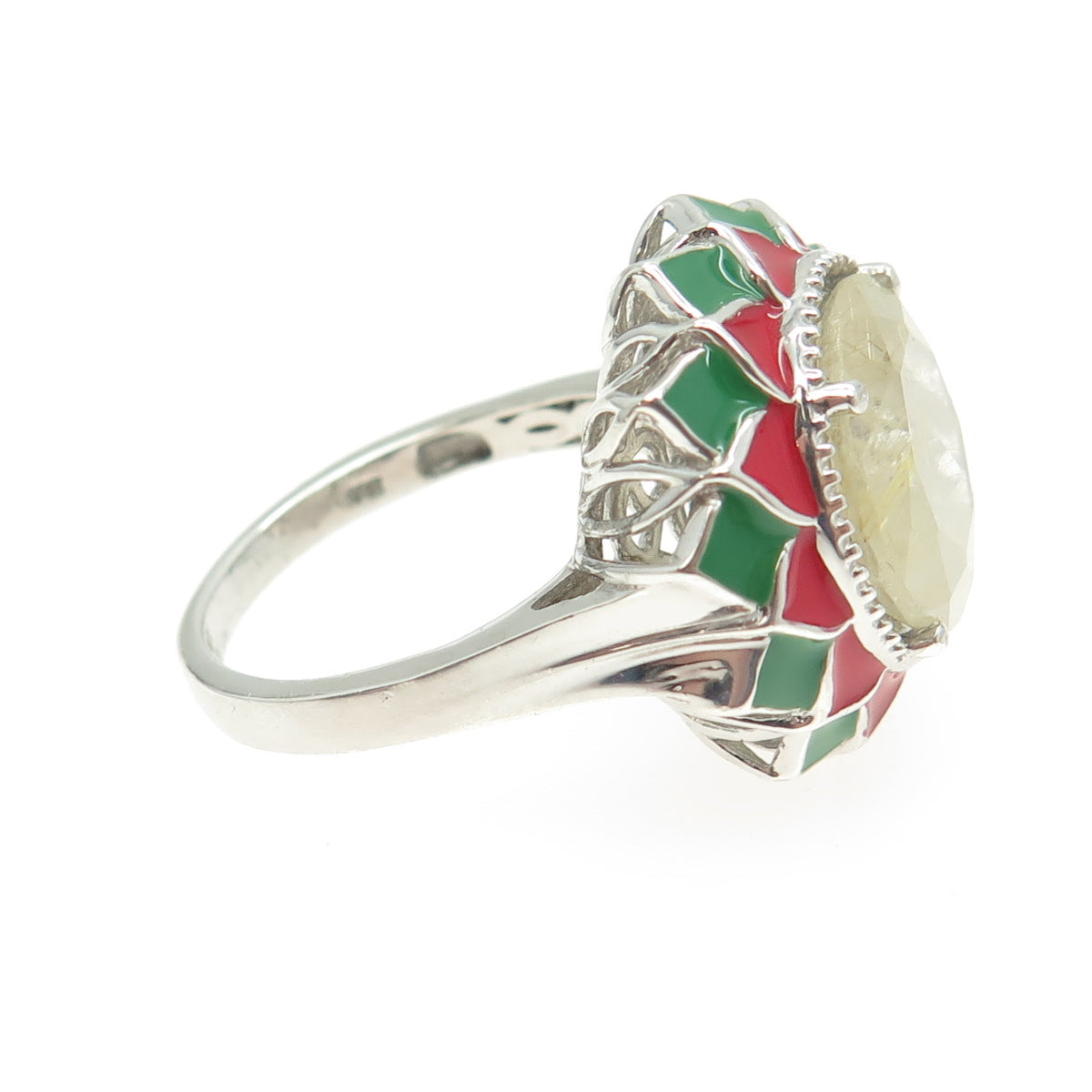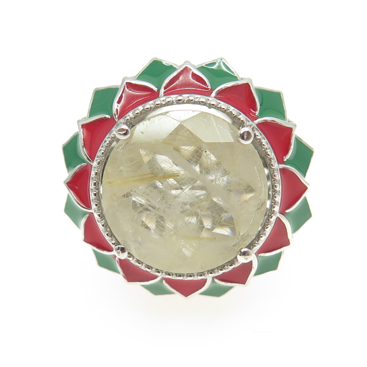 CHUCK CLEMENCY 925 Sterling Silver Real Rutilated Quartz Enamel Ring Size 11.25