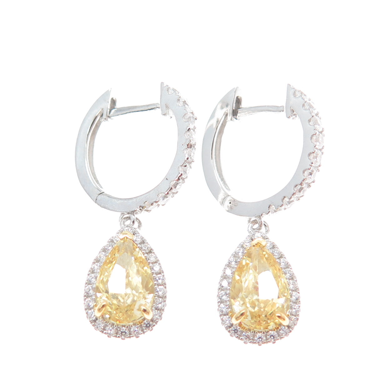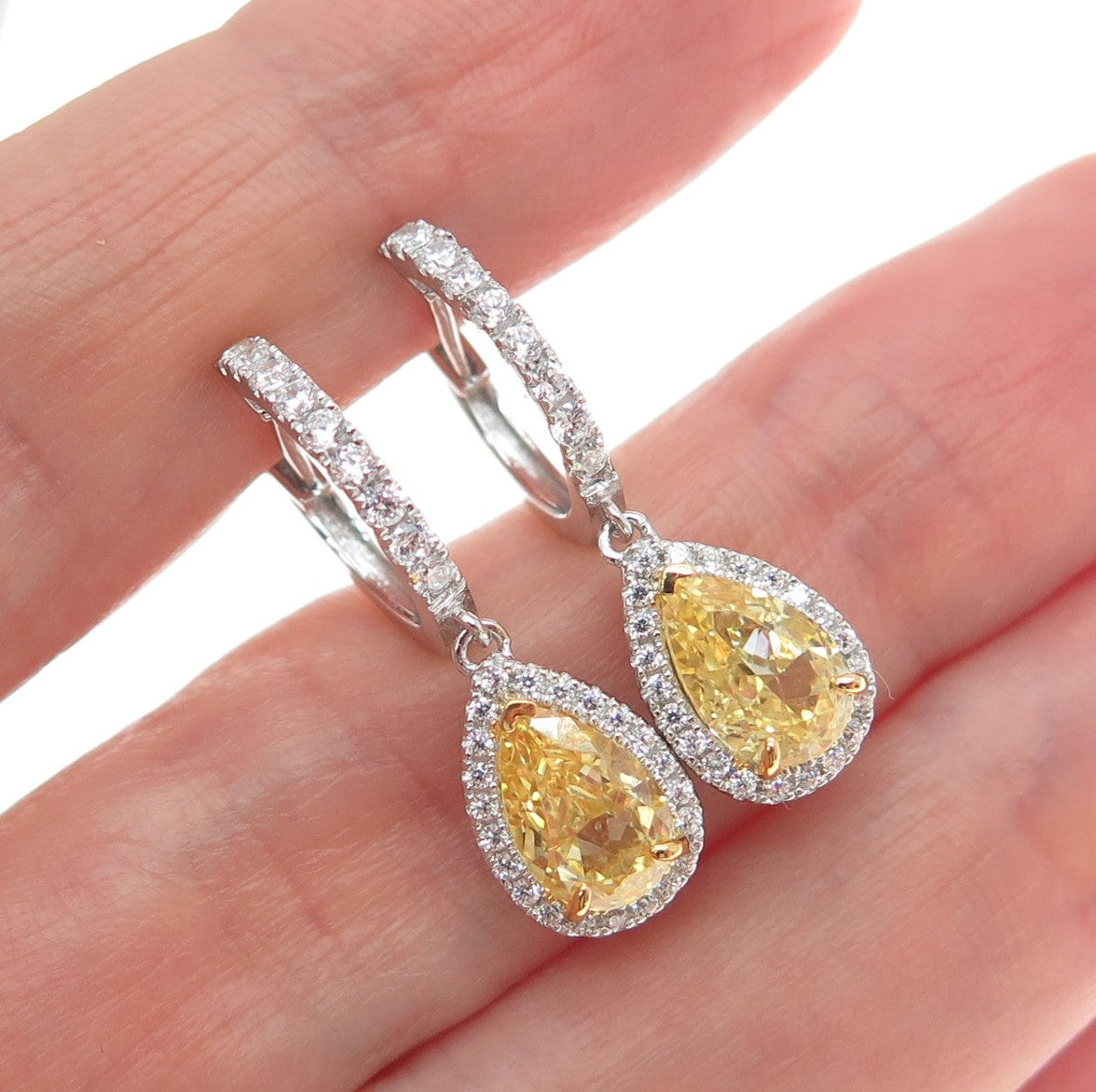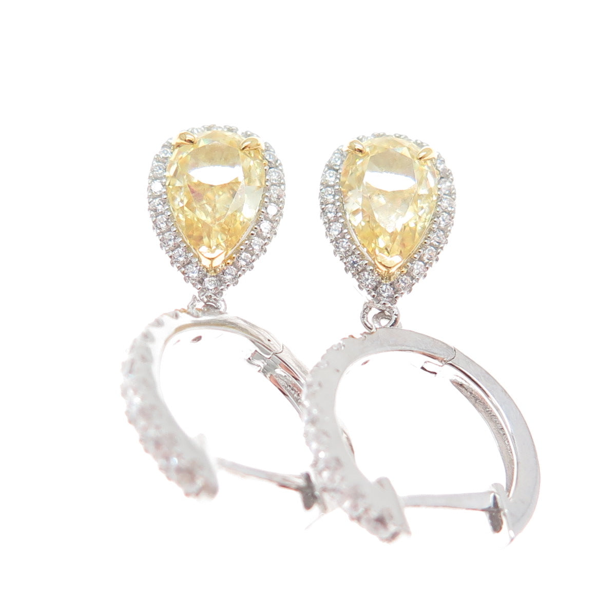 DSMK Sterling Silver Pear-Cut Canary & Round-Cut White C Z Hoop Dangle Earrings
