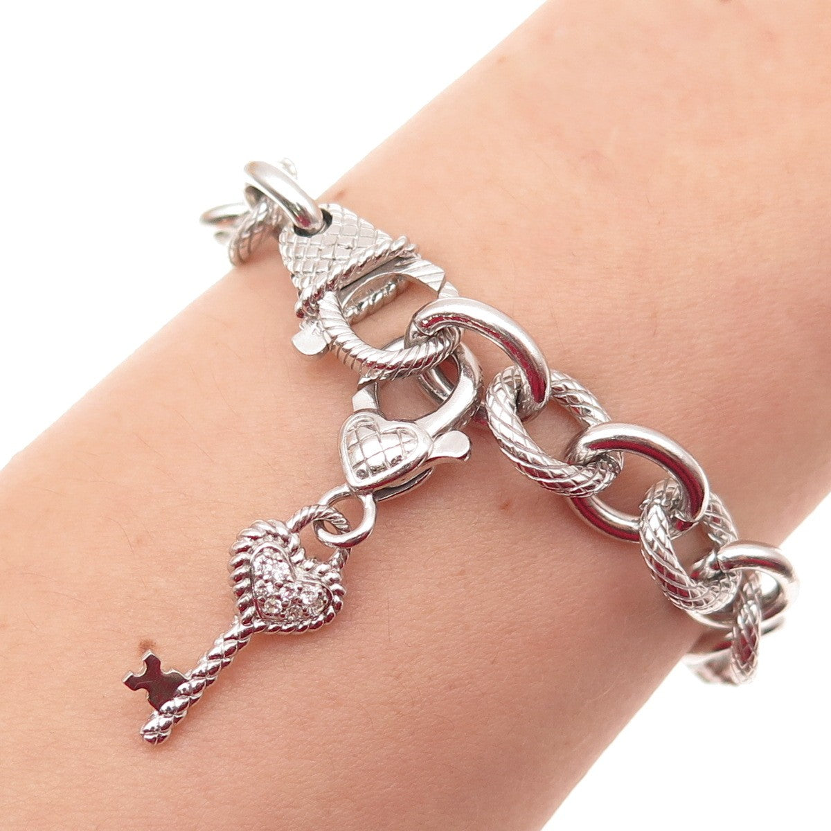 JUDITH RIPKA 925 Sterling Silver Round-Cut C Z Key Charm Bracelet 7.25"