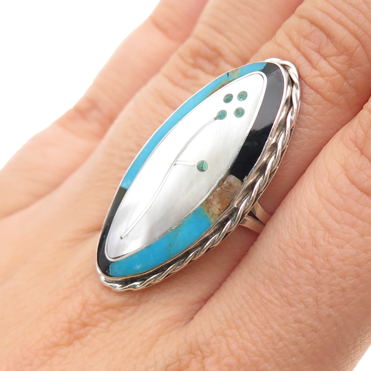 Old Pawn Sterling Silver Vintage Southwestern Turquoise Onyx MOP Ring Size 6.25