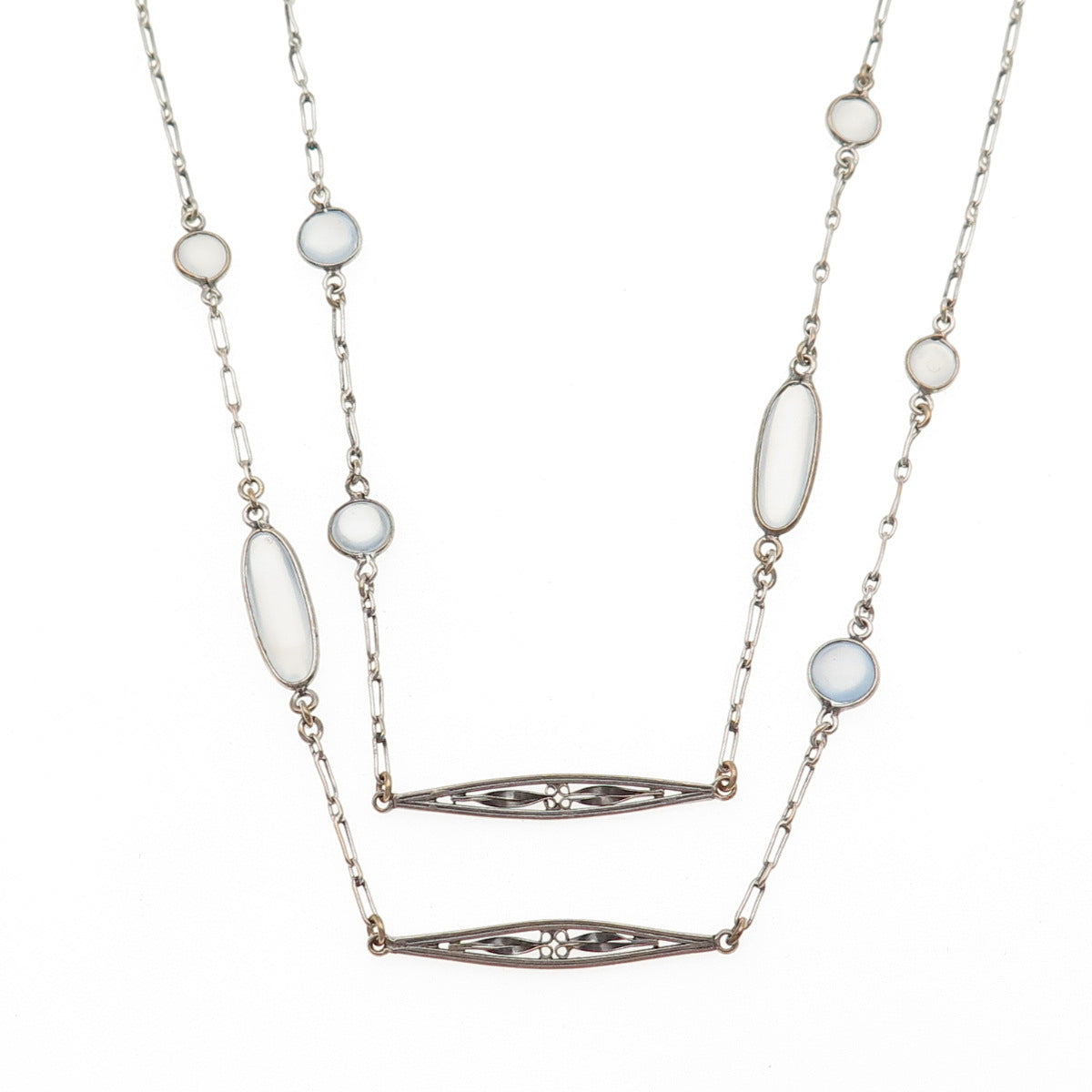 Silver-Tone Antique Art Deco Opalite Long Chain Necklace 56"