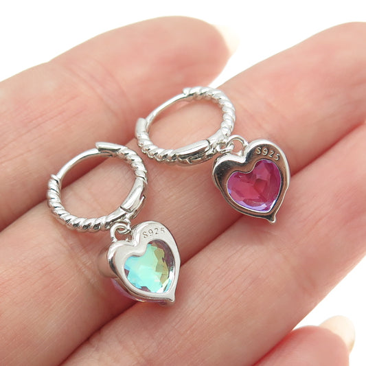 925 Sterling Silver Real Pink Opal Gemstone Heart Dangle Huggie Earrings